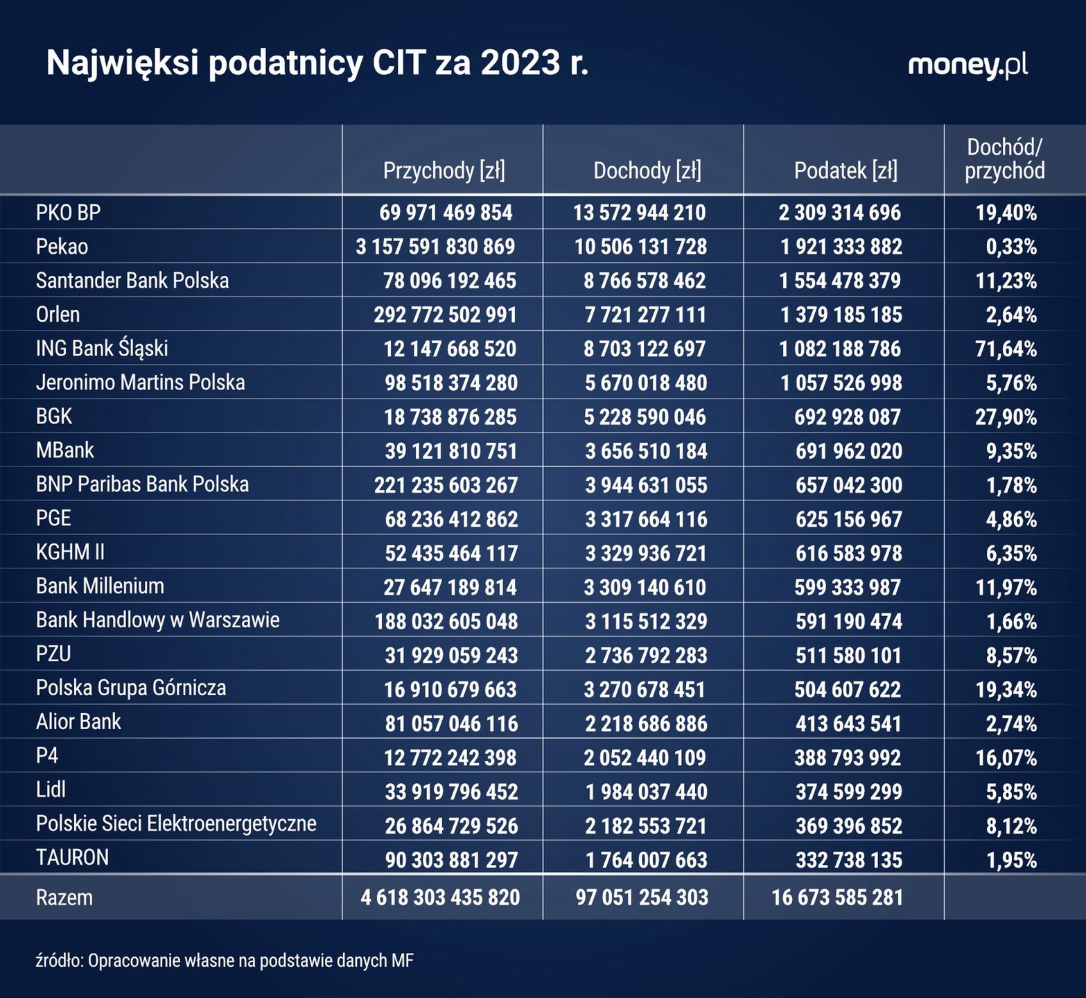 Łącznie 20 największych płatników CIT zasiliło budżet państwa kwotą 16,7 mld zł, co stanowi prawie 25 proc. łącznej kwoty wpływów z tego podatku za 2023 r.