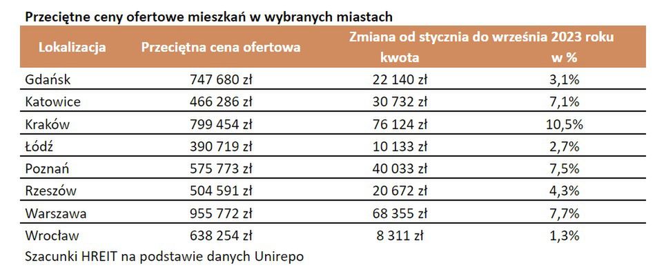 Dane te pokazują, że mieszkania drożeją. Licząc od stycznia do września br. mieliśmy do czynienia ze wzrostem o od około 10 tysięcy złotych we Wrocławiu czy Łodzi do ponad 60-70 tysięcy w Krakowie czy Warszawie - wylicza Bartosz Turek, główny analityk HRE Investment Trust.