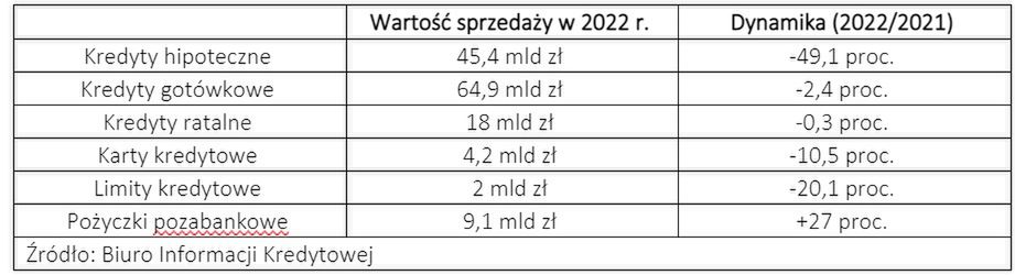 Według przedstawionych danych, w 2022 r. wartość nowych kredytów i pożyczek zaciągniętych przez Polaków wyniosła 143,6 mld zł. Jednak w porównaniu do 2021 r. łączna kwota większości kredytów i pożyczek udzielonych w ubiegłym roku była niższa. Szczególnie dobrze pokazuje to przykład kredytów hipotecznych, których sprzedaż zmniejszyła się o 49,1 proc. Poziom sprzedaży z 2021 r. utrzymały tylko kredyty ratalne, a wzrosty wartościowe (o 27 proc.) i ilościowe (o 22 proc.) odnotowały tylko pożyczki pozabankowe.