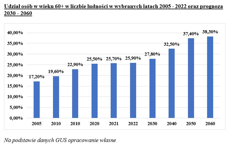 W 2005 r. osoby w wieku 60+ stanowiły w Polsce tylko 17,2 proc. populacji, w 2022 r. było ich już 25,9 proc., a zgodnie z prognozą GUS w 2060 r. będą oni stanowili prawie 40 proc. naszej populacji.