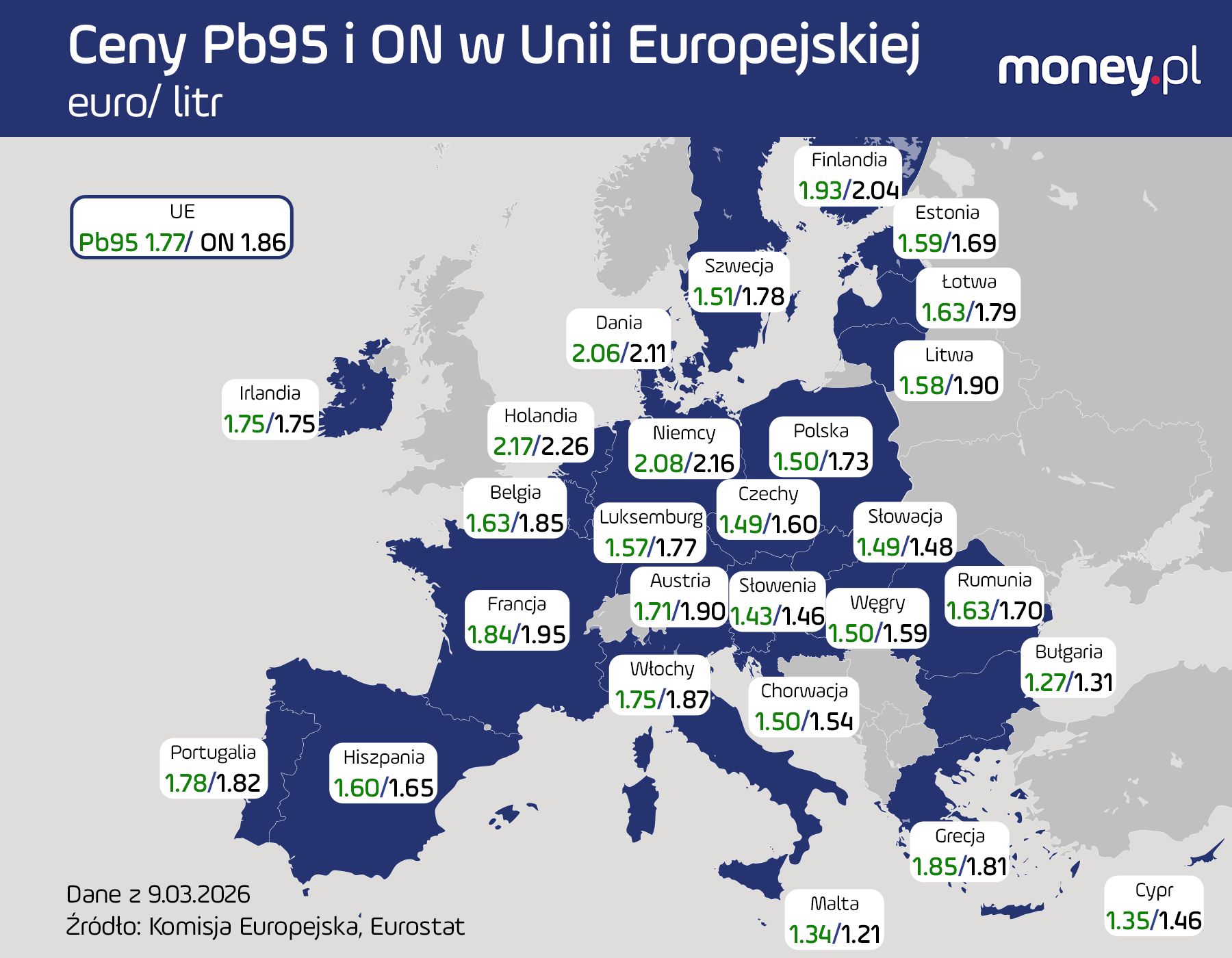 Benzyna Eurosuper-95 najdroższa jest w trzech krajach Unii Europejskiej – Holandii, Niemczech i Danii. Kierowcy płacą tam średnio powyżej 2 EUR za litr tego popularnego paliwa - wynika z opublikowanego w czwartek raportu paliwowego Komisji Europejskiej i Eurostatu, zawierającego dane z 27 państw UE zebrane w poniedziałek, 9 marca. Średnia dla UE to 1,77 EUR za litr. Na tym tle Polska jest jednym z tańszych krajów, z wynikiem 1,5 EUR za litr, podobnie jak Chorwacja i Węgry.