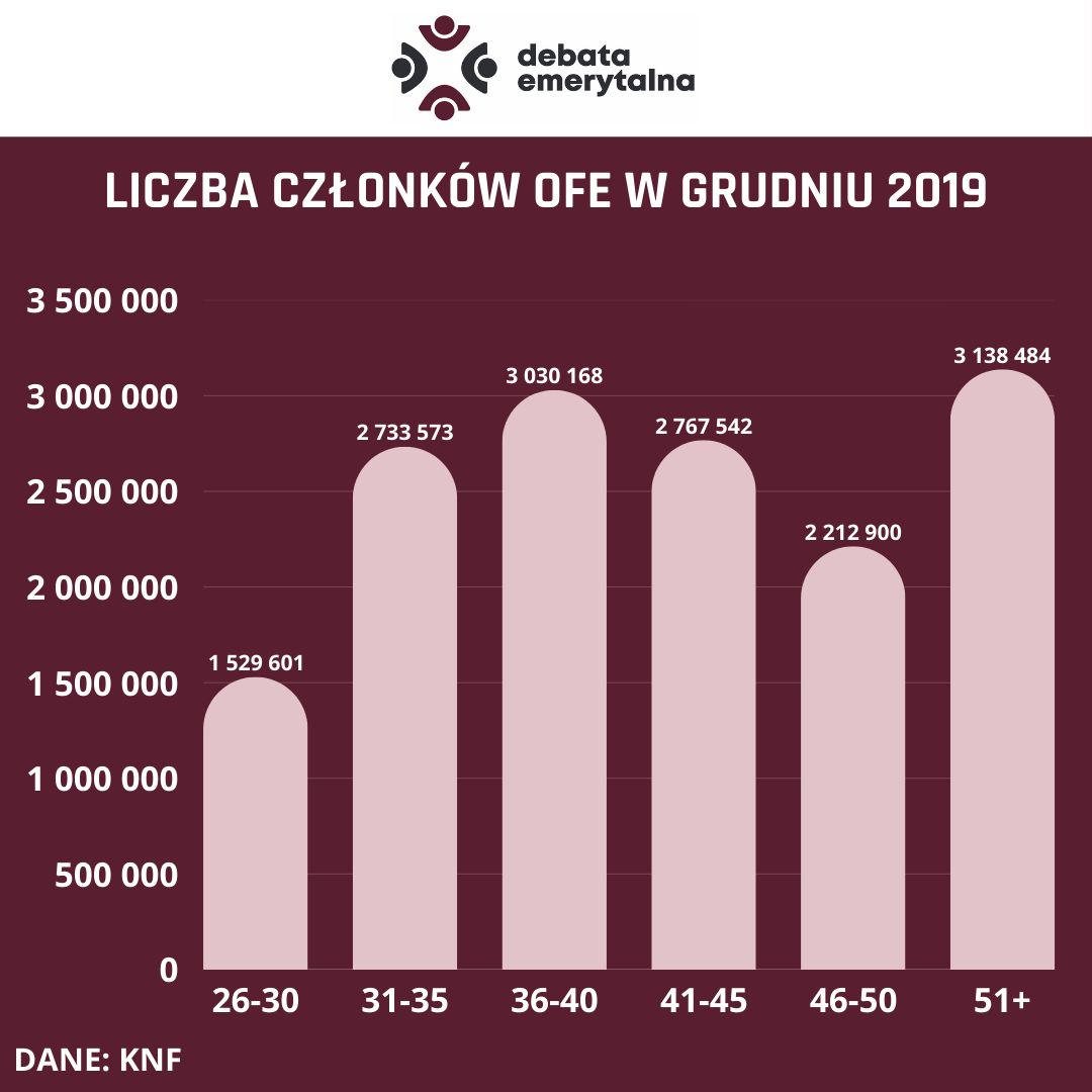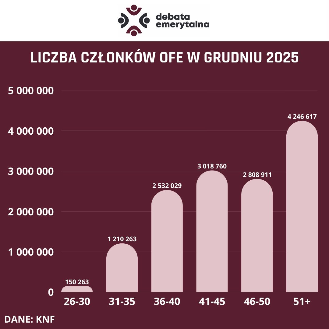 Dane KNF wskazują, że w grudniu 2025 roku w OFE liczba członków OFE wynosiła już poniżej 14 mln osób (13,96 mln). Dla porównania, 6 lat wcześniej, na koniec grudnia 2019 roku, było ponad 15,67 mln członków OFE. Liczba ta zmniejsza się z każdym miesiącem.