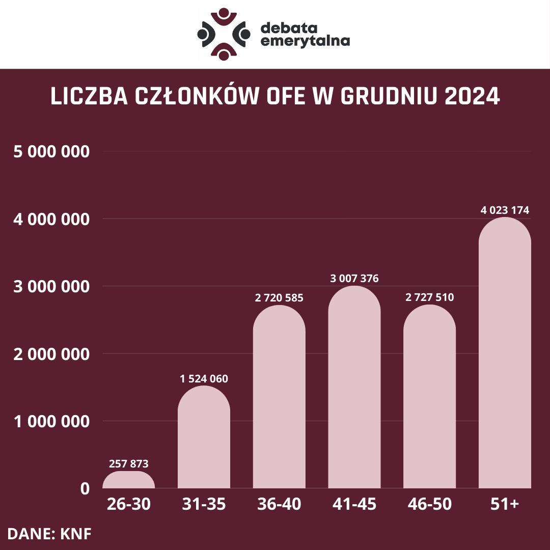 Dla porównania 6 lat temu, w grudniu 2019 roku liczba członków OFE wynosiła ponad 15,67 mln osób, poza tym struktura demograficzna osób oszczędzających w tej formie wyglądała zupełnie inaczej. Osoby w wieku 46 lat i więcej stanowiły niespełna 35 proc. wszystkich członków OFE. Osób w wieku 26–30 lat było ponad półtora miliona, natomiast tych w wieku 21–25 lat było ponad ćwierć miliona. Co ciekawe, pięć lat temu grupa osób w wieku 51 lat i więcej była nieznacznie większa od grupy osób w wieku 36 – 40 lat. W grudniu 2025 roku różnica w liczebności pomiędzy tymi grupami to ponad 1,7 mln osób.