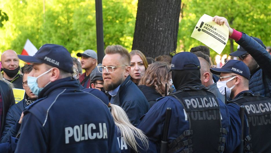 - Wzywam policję do zachowania spokoju - mówił z kolei przez swój megafon poseł Grzegorz Braun, obecny w protestującym tłumie. Poseł bezskutecznie domagał się kontaktu z dowodzącym akcją.