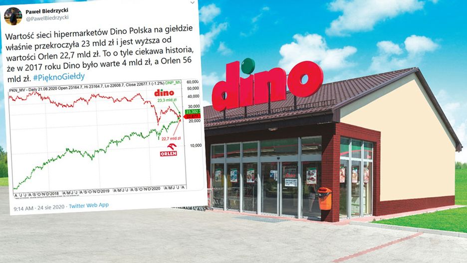 Dino wyprzedziło Orlen. Sieć marketów przebiła w ostatnich dniach 23 mld zł (na tyle inwestorzy wyceniają jej cały biznes), podczas gdy kapitalizacja paliwowego koncernu spadła poniżej tej granicy.