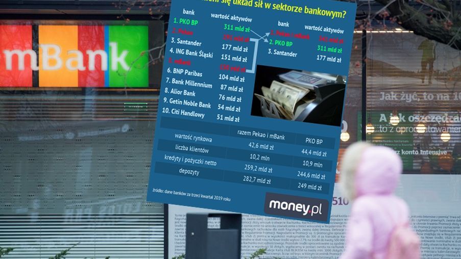 Na koniec września 2019 roku (ostatnie oficjalne dane banków) sam bank PKO BP miał aktywa warte 311 mld zł. Daleko za nim był drugi Pekao z wynikiem na poziomie 191 mld zł. Dopiero na piątym miejscu (jeszcze za Santanderem i ING) znajdował się mBank z aktywami wycenianymi na 150 mld zł. Razem mieliby około 341 mld zł, wyprzedzając o 30 mld zł obecnego lidera.