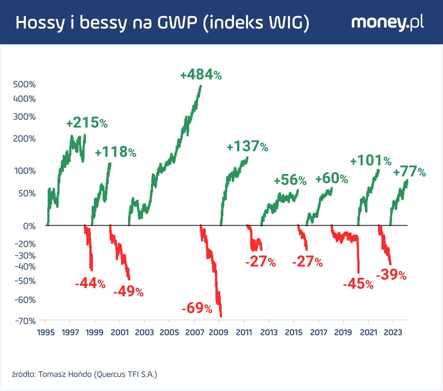 Dobra wiadomość jest taka, że większość hoss miała jeszcze większy zasięg niż obecny na razie niespełna 80-proc. wzrost. Przykładowo, poprzednia fala zwyżkowa trwająca od czasu pandemicznego krachu w marcu 2020 r. do końcówki 2021 r. podniosła wartość WIG-u o ponad 100 proc. Jeszcze bardziej okazałe były hossy po globalnym kryzysie finansowym (licząc od dołka z lutego 2009), czy też po tzw. kryzysie rosyjskim z 1998 r., nie mówiąc już o rekordowej serii wzrostowej z lat 2003-2007, kiedy to wartość indeksu giełdowemu urosła niemal pięciokrotnie.