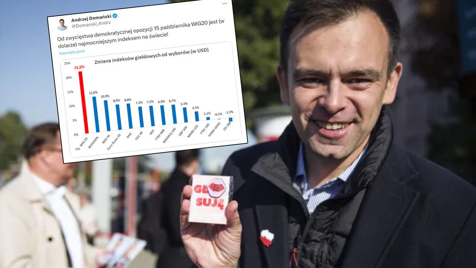 "Od zwycięstwa demokratycznej opozycji 15 października WIG20 jest (w dolarze) najmocniejszym indeksem na świecie" - napisał w mediach społecznościowych Andrzej Domański. Nie wszyscy zgodzili się z tezą przedstawioną przez polityka PO, który ma szansę - według nieoficjalnych doniesień Money.pl - stanąć na czele resortu finansów.