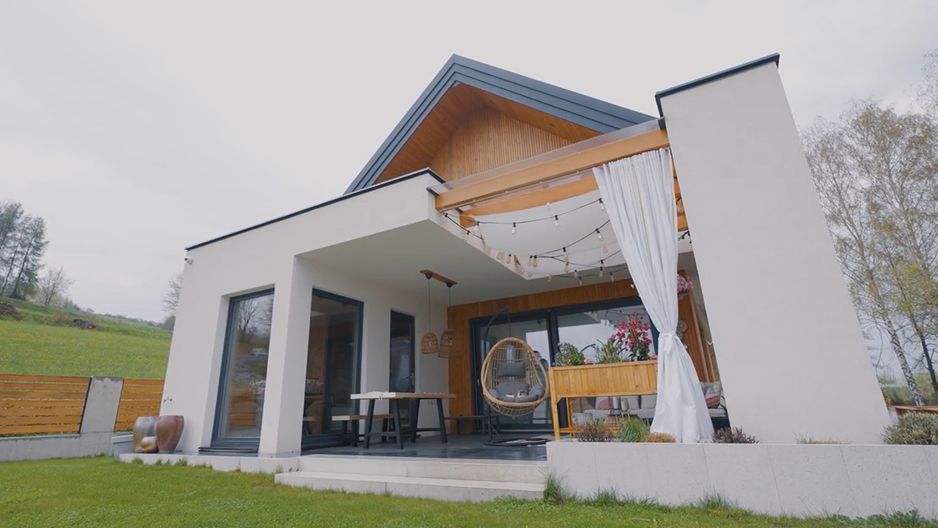 Wyobraźcie sobie, że szukacie idealnej działki. Znajdujecie ogłoszenie i dowiadujecie się, że działka jest długa, wąska i w dodatku ma dwa duże spadki. Jak w takim miejscu zbudować wygodny dom? Właściciele postawili na typ zabudowy w stylu nowoczesnej stodoły. – Dom postawiliśmy w technologii szkieletowej, drewnianej. Z uwagi na duże rozpiętości musieliśmy wzmocnić konstrukcję poprzez zwiększenie przekroju belek stropowych – opowiada nam Kamila Rusnak, właścicielka. – Dostaję dużo pytań o to, jak się mieszka w domu drewnianym. Powiem krótko: mieszkamy tu już trzy lata i nie wyobrażam sobie powrotu do murów. Mam trójkę dzieci, dlatego priorytetem była dla mnie przytulność – przekonuje. Przestronność domu robi ogromne wrażenie. Właściciel kochają drewno, widać to w nowoczesnym, ale bardzo przytulnym wnętrzu. Ta sama deska jest zarówno na ścianie, jak i na podłodze. W salonie gości wita dębowy stół i pięknie odsłonięte belki konstrukcyjne. W tym wnętrzu panuje szaleństwo: faktur, tekstur i kolorów, co podkreśla nietuzinkowy charakter właścicieli. Schody zbudowali sami, po tym, jak firmy wyceniły koszt ich postawienia na ok. 30 tys. zł. Ostatecznie wydali 6 tys. zł. W sypialni na piętrze znajdują się szerokie łoże małżeńskie i piętrowe łóżko dzieci, które uwielbiają noce spędzać z rodzicami. Z wanny, znajdującej się w łazience tuż obok, można podziwiać widok na krajobrazy Beskidu. Pokój córki to spełnienie marzeń każdej dziewczynki. Królują pudrowy róż, piękne dodatki i huśtawka zwisająca z sufitu. W domu znalazło się także skrzydło dla gości, garaż i część gospodarcza. Nie zabrakło uroczego tarasu, który tętni życiem w słoneczne dni. Godna podziwu jest spójność i skupienie na detalu, które towarzyszyły właścicielce przy wykańczaniu tego rodzinnego domu. Koszt budowy w 2019 r. wyniósł 840 tys. zł, czyli 3 tys. zł za mkw. Dziś byłby on dwukrotnie wyższy. Jest jednak jedna rzecz, która pani Karolina zmieniłaby, gdy budowała ten dom po raz drugi. Jaką? Obejrzyjcie najnowszy odcinka programu „Pomysłu na dom”, w którym o wszystkim opowiada Kuba Jankowski.
