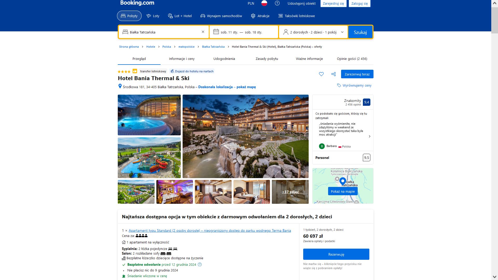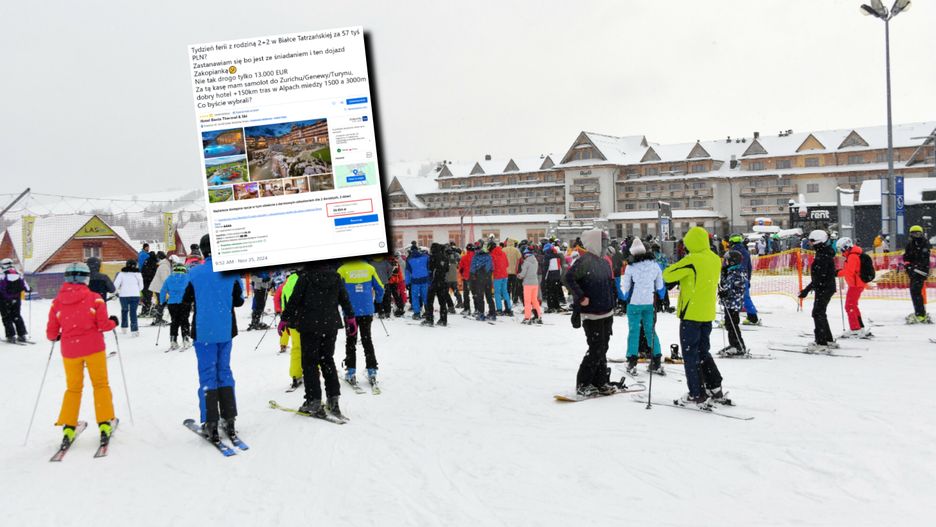 "Tydzień ferii z rodziną 2+2 w Białce Tatrzańskiej za 57 tys. zł. Zastanawiam się, bo jest ze śniadaniem, i ten dojazd Zakopianką. Nie tak drogo - tylko 13 tys. euro. Za tę kasę mam samolot do Zurychu/Genewy/Turynu, dobry hotel +150 km tras w Alpach między 1500 a 3000 metrów. Co byście wybrali?" - napisał w utrzymanym w żartobliwym tonie użytkownik platformy X. W ten sposób odniósł się do oferty noclegu w hotelu Bania Thermal & Ski, którą znalazł w serwisie Booking.com.