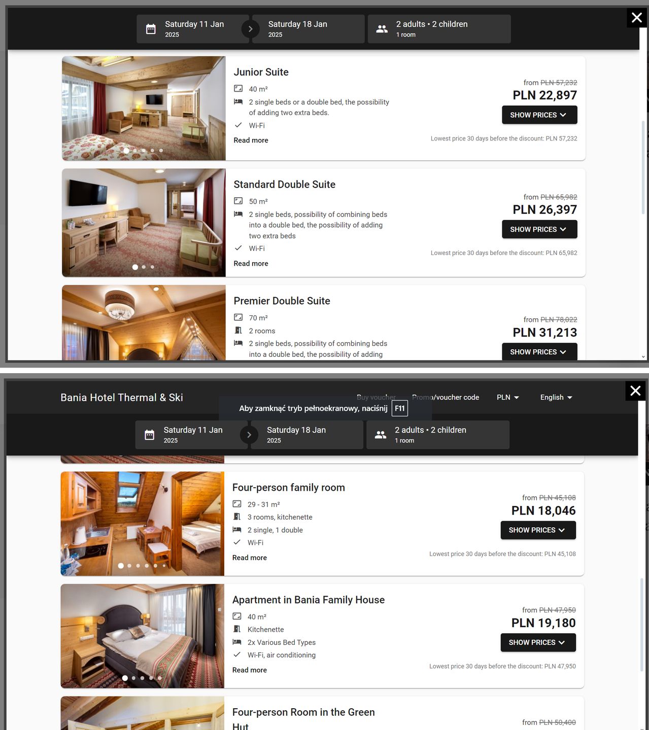 Sprawdzamy, czy oferta, na temat której rozgorzała taka dyskusja, nie jest wynikiem awarii lub osobliwości algorytmów, które ustalają ceny w tego typu portalach rezerwacyjnych. W serwisie Booking.com nie ma już wolnych pokoi w tym obiekcie na pierwszy tydzień ferii. Udaje nam się natomiast znaleźć ofertę na przykład na tydzień przed feriami: w dniach od soboty 11 do soboty 18 stycznia. Cena dla dwójki rodziców i dwójki dzieci w wieku 6 i 10 lat: prawie 61 tys. zł.