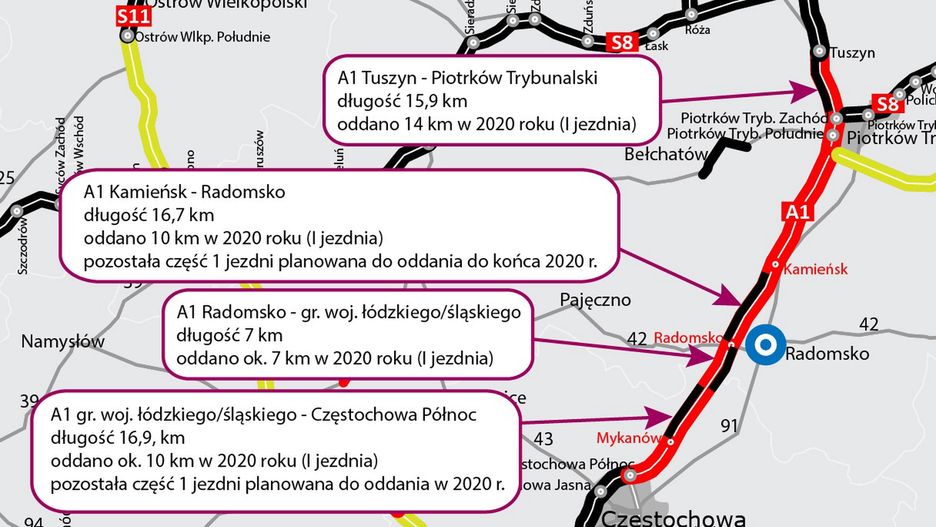 Docelowo autostrada A1 pomiędzy Łodzią a Częstochową ma mieć 4 pasy, po dwa w każdym kierunku.