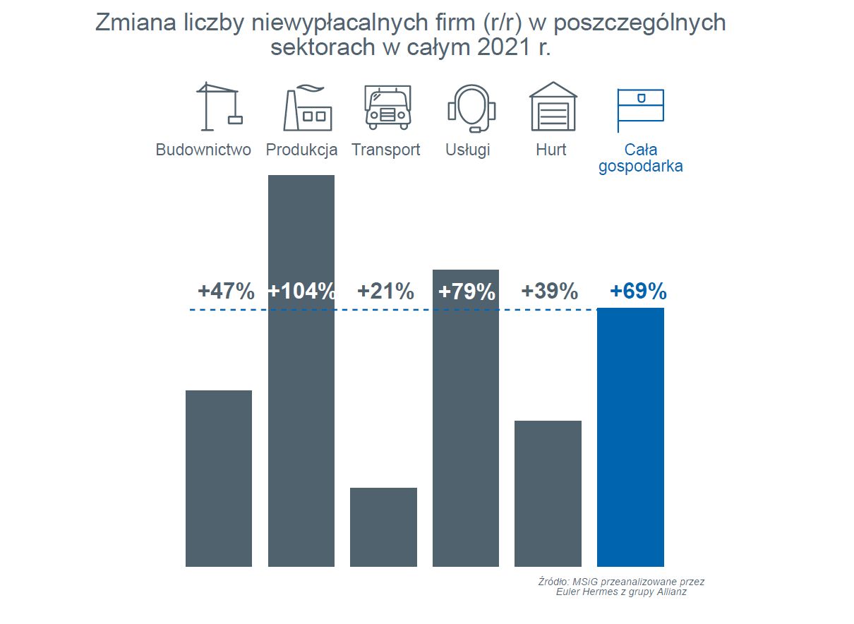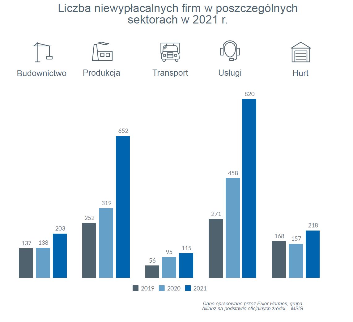 Jak wynika z danych Euler Hermes, na koniec roku widać było wyraźną poprawę w transporcie, nieznacznie spowolnił wzrost niewypłacalności w usługach oraz handlu. Utrzymała się natomiast skala wzrostu upadłości firm produkcyjnych (w tym rekordowa liczba firm spożywczych). W budownictwie po 3 kwartałach sytuacja była lepsza niż rok wcześniej, natomiast w ostatnich trzech miesiącach 2021 roku liczba upadłości gwałtownie wzrosła.