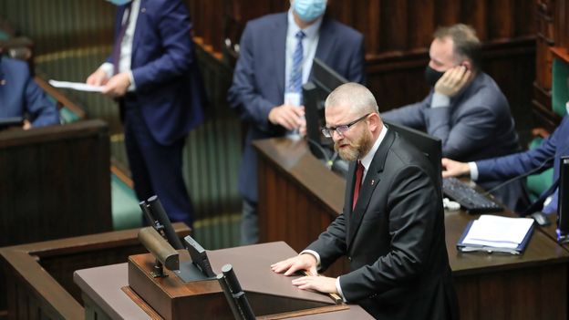 Komisja Etyki Poselskiej ukarała posła Konfederacji Grzegorza Brauna za słowa skierowane w Sejmie wobec ministra zdrowia: "Będziesz pan wisiał". Braun został ukarany naganą. - Działalność pana posła i te groźby to jest absolutny skandal. Każdy to widzi, tu nie ma dyskusji. Jak byłem mały i dokazywałem, to moi rodzice zachowywali się tak, by nie prowokować moich dalszych działań. Pokazywali mi, że te moje wyskoki nie robią na nich wrażenia. Myślę, że zastosowanie tej metody wobec pana Brauna przyniesie najlepsze rezultaty - powiedział w programie "Money. To się liczy" minister Janusz Cieszyński, pełnomocnik rządu ds. cyberbezpieczeństwa. - Zachowanie pana Grzegorza Brauna komentuje się samo. Każdy przyzwoity człowiek wie, że to po prostu skandal. Na takie słowa nie ma miejsca w debacie publicznej - dodał.