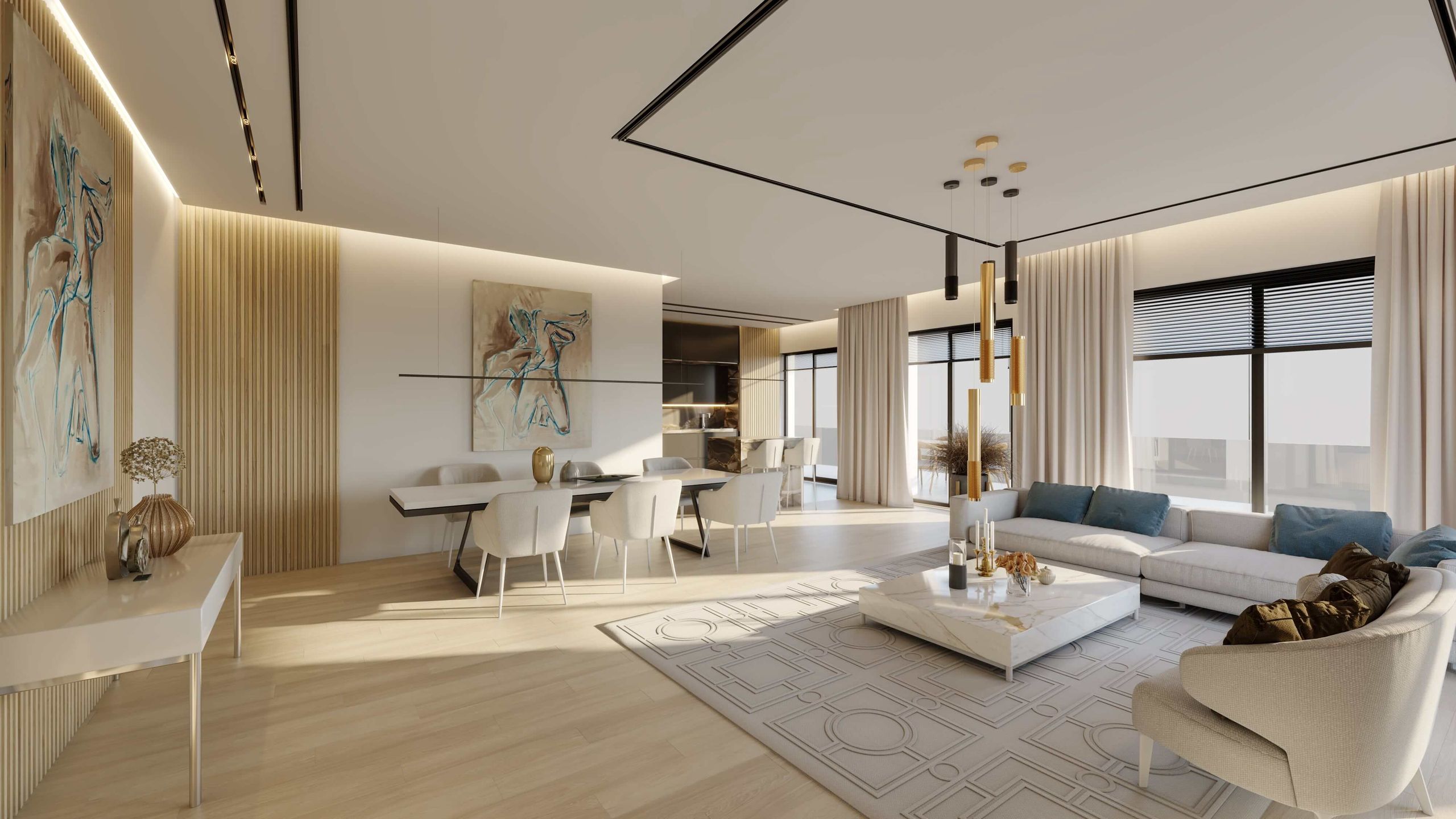Wnętrza są dziełem projektantów z Artkam design – łączą w sobie elegancję oraz ponadczasowość. Wykonane z najlepszych materiałów, w jasnych i ciepłych kolorach z ciemnymi akcentami użytymi do pokrycia podłóg, ścian czy elementów ozdobnych. W środku nie zabraknie zaprojektowanych na zamówienie ręcznie robionych drzwi, designerskich żyrandoli czy dywanów i lamp z powtarzającym się monogramem inwestycji. Części wspólne mają przypominać te spotykane w najlepszych butikowych hotelach.