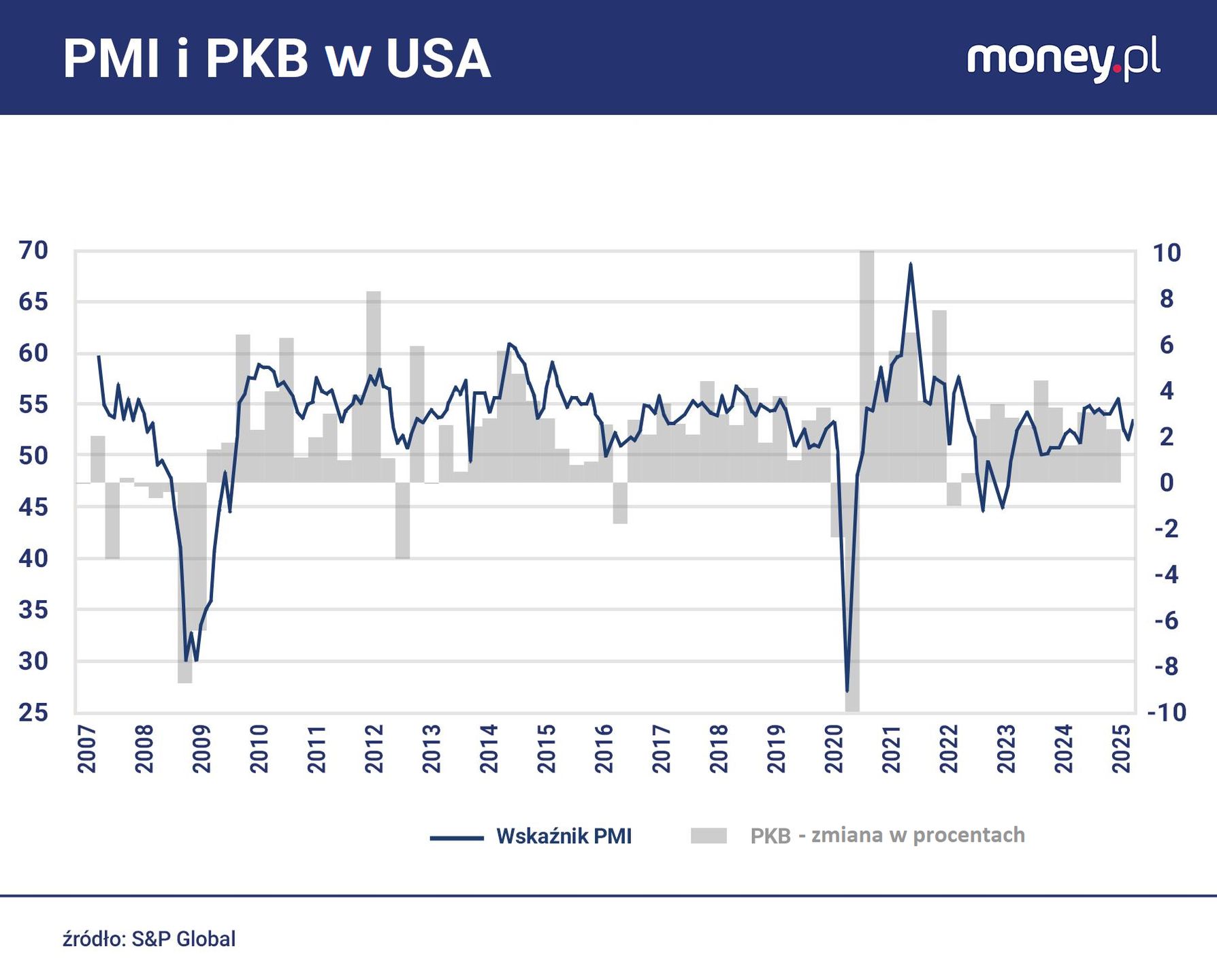 I dodaje, że wcześniejsza poprawa nastrojów w przemyśle była częścią szerszego światowego trendu, związanego z wygasaniem efektów podwyżek cen energii i stóp procentowych z poprzednich lat, zmniejszaniem stanów zapasów, stymulacją popytu w Chinach, złagodzeniem problemów sektorowych (w motoryzacji i produkcji półprzewodników) i przygotowywaniem się eksporterów i importerów do wojny celnej.