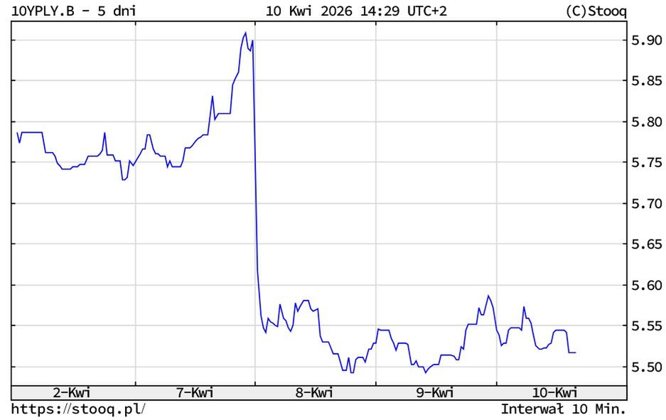 Po tym, jak w nocy z wtorku na środę Donald Trump ogłosił dwutygodniowy rozejm na Bliskim Wschodzie, doszło do gwałtownego spadku rentowności polskich obligacji skarbowych o dziesięcioletnim terminie zapadalności. Na przestrzeni zaledwie kilku dni notowania kluczowego instrumentu dłużnego przeszły wyraźną i dynamiczną korektę. Po osiągnięciu lokalnego szczytu w okolicach 5,90 proc. we wtorek, w środę kurs gwałtownie zanurkował - w stronę poziomu 5,50 proc. Taki ruch odzwierciedla spadek premii za ryzyko geopolityczne, która w ostatnich tygodniach dławiła globalne parkiety.
