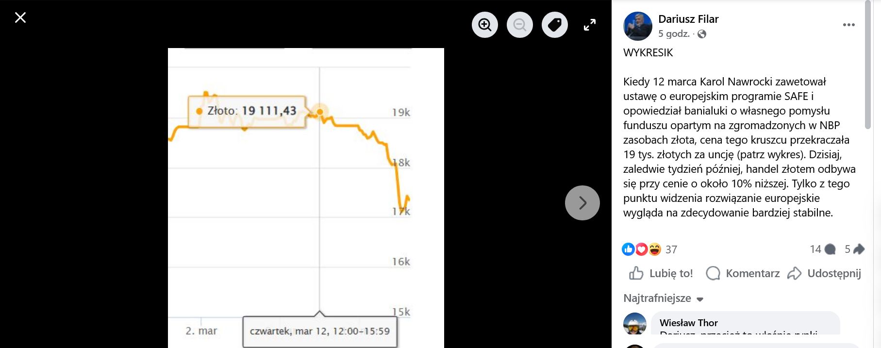 Swój wpis Filar opatrzył wykresem notowań złota, obrazującym dynamiczny spadek ceny kruszcu między 2 a 19 marca bieżącego roku. Wykres pokazuje, że po kilku tygodniach względnej stabilizacji cena gwałtownie obniżyła się właśnie w okolicach daty weta i ogłoszenia propozycji funduszu zbrojeniowego opartego na złocie NBP.