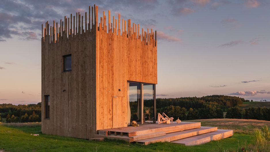 Na Mazurach, dosłownie w szczerym polu, stoi dom, jakich mało. Kształtem, dzięki wystającym pionowo ponad dach deskom nierównej długości, przypomina kostkę słomy. Jest wprawdzie niewielki, ale dzięki olbrzymim przeszkleniom i temu, że przestrzeń jest częściowo otwarta do góry na wysokość sześciu metrów, sprawia wrażenie przestronnego. Ten przytulny, ale nowoczesny dom był budowany na zgłoszenie, więc jego podstawa to kwadrat o powierzchni ok. 35 m kw., ale całkowita powierzchnia użytkowa dzięki sprytnym rozwiązaniom architektonicznym wynosi prawie 50 m kw. Koszt budowy do stanu deweloperskiego zamknął się w 230 tys. zł.