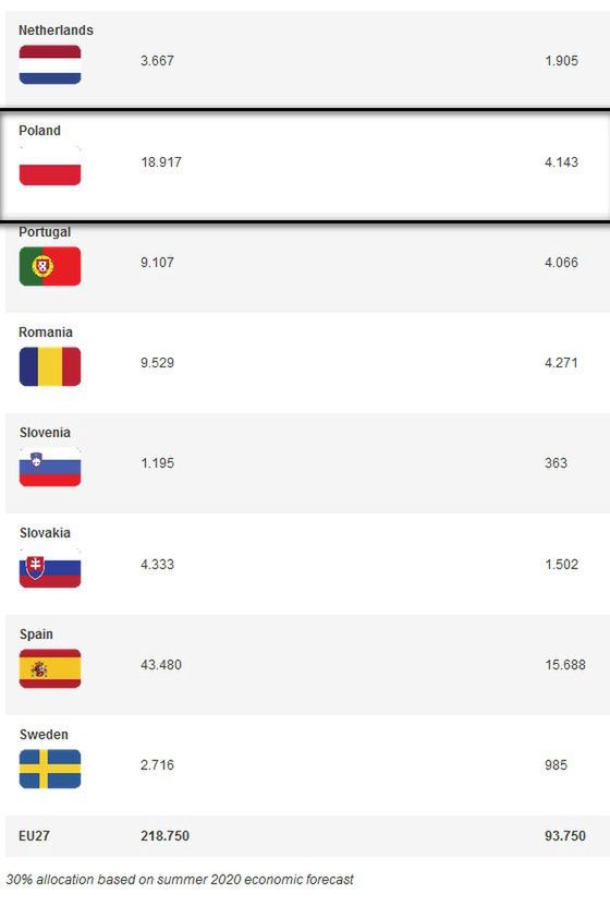 Łącznie dla wszystkich krajów UE budżet przewiduje wypłatę 218,750 mld euro do 2021 roku i 93,750 do 2023.
