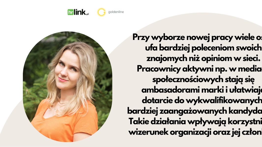 - Przyciąganie nowych talentów do organizacji to trudny proces, w którym pomocni mogą okazać się jej obecni pracownicy. Przy wyborze nowej pracy wiele osób ufa bardziej poleceniom swoich znajomych niż opiniom w sieci. Pracownicy aktywni np. w mediach społecznościowych stają się ambasadorami marki i ułatwiają dotarcie do wykwalifikowanych, bardziej zaangażowanych kandydatów. Takie działania wpływają korzystnie na wizerunek organizacji oraz jej członków. - mówi Karolina Antczak, ekspertka marki pracodawcy w HRlink.