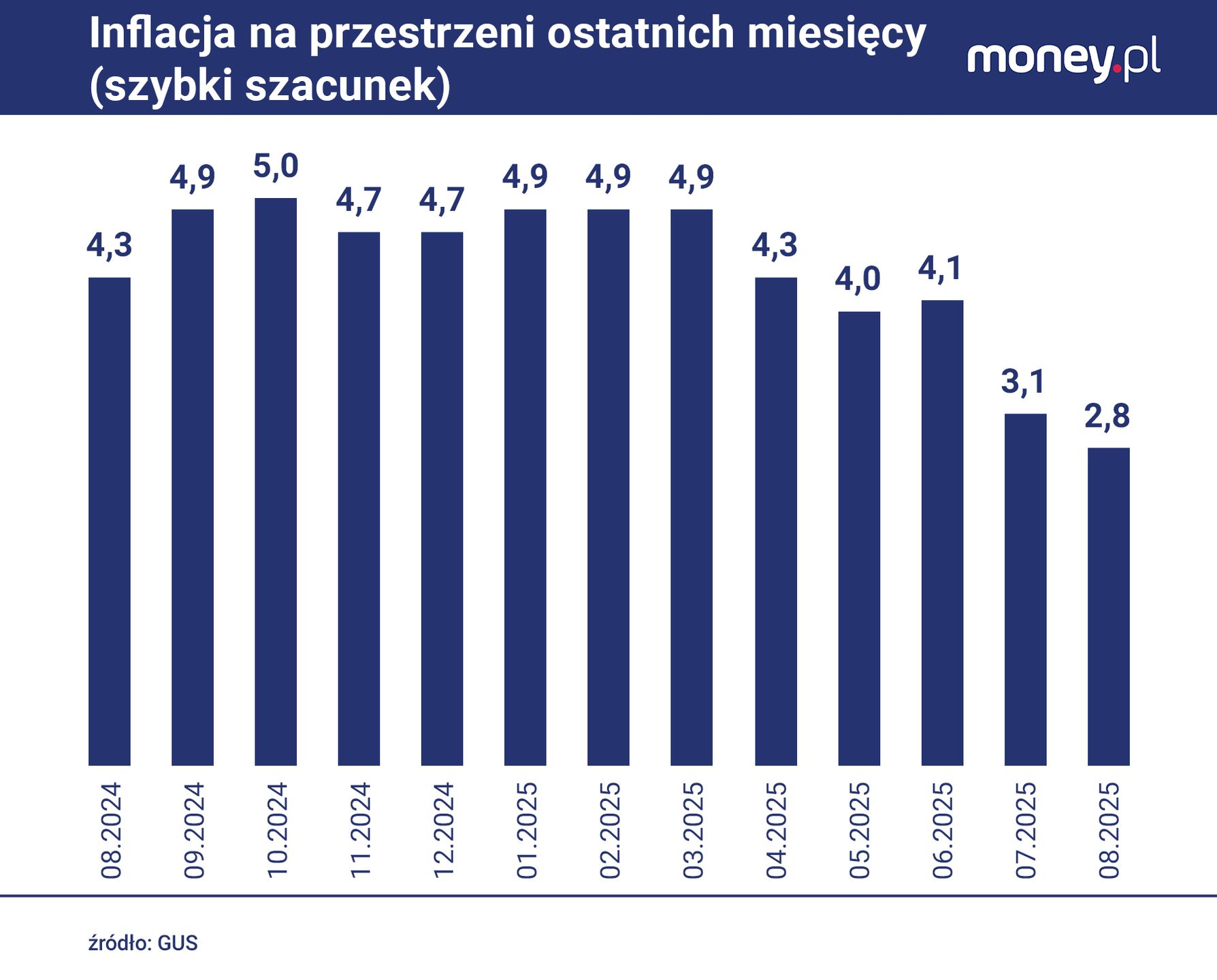 Dane GUS pokazują, że po okresie podwyższonej inflacji w pierwszej połowie 2025 roku, gdy wskaźnik utrzymywał się w przedziale 4,0-5,0 proc., od czerwca obserwujemy wyraźny trend spadkowy. W czerwcu inflacja wynosiła 4,1 proc., w lipcu 3,1 proc., a teraz spadła do 2,8 proc.