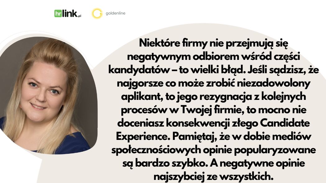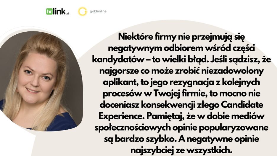 – Niektóre firmy nie przejmują się negatywnym odbiorem wśród części kandydatów – to wielki błąd. Jeśli sądzisz, że najgorsze co może zrobić niezadowolony aplikant, to jego rezygnacja z kolejnych procesów w Twojej firmie, to mocno nie doceniasz konsekwencji złego Candidate Experience. Pamiętaj, że w dobie mediów społecznościowych opinie popularyzowane są bardzo szybko. A negatywne opinie najszybciej ze wszystkich – mówi Alina Michałek, ekspert HR w HRlink i Goldenline.