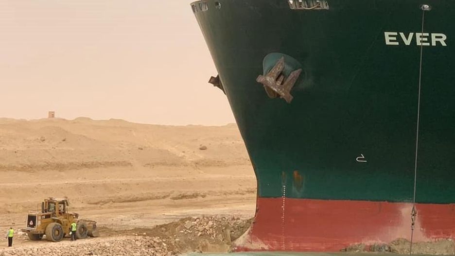 Ever Given, kontenerowiec dłuższy niż Wieża Eiffla, płynął z Chin do Rotterdamu. Został uziemiony wcześnie we wtorek z powodu słabej widoczności.