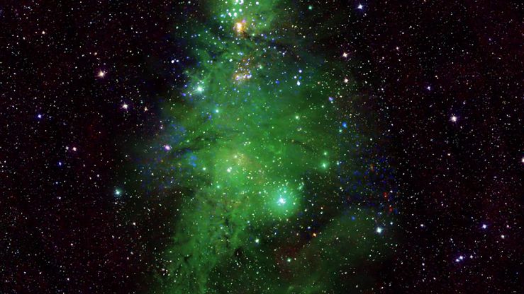 NASA opublikowała kosmiczno-bożonarodzeniowe zdjęcie. Widać na nim kosmiczną choinkę, której gwiazdy są otulone zielonym welonem, a pomiędzy nimi błyszczą niebieskie i białe kropki – pisze niemiecki "Bild".