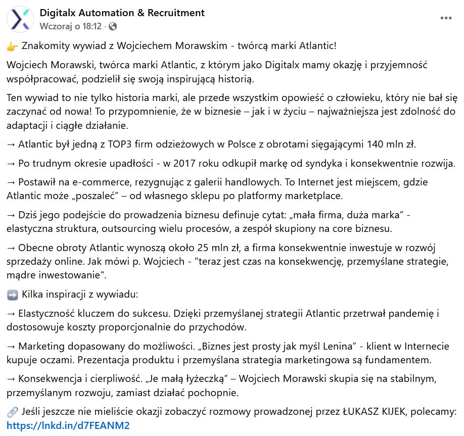 "Ten wywiad to nie tylko historia marki, ale przede wszystkim opowieść o człowieku, który nie bał się zaczynać od nowa! To przypomnienie, że w biznesie – jak i w życiu – najważniejsza jest zdolność do adaptacji i ciągłe działanie" - skomentowała z kolei na Facebooku firma DIGITALX, która współpracuje obecnie z Morawskim.