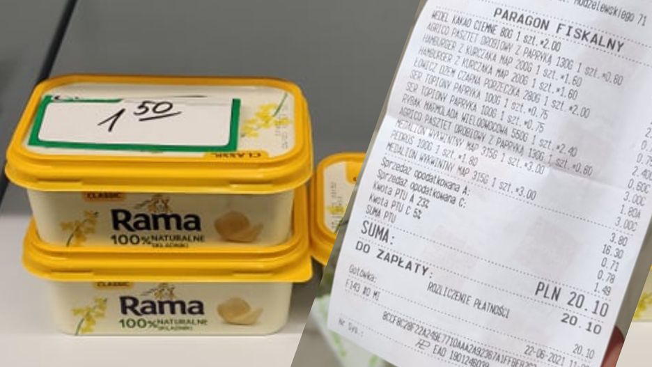 Rozmówca również pokazał nam swój paragon. W jego torbie znalazły się trzy butelki wody o pojemności 1,5 l, proszek i mleczko do czyszczenia powierzchni, cztery dżemy, ścierka z mikrofibry, pół kg kawy i dwie herbaty. Koszt? 22,98 zł.