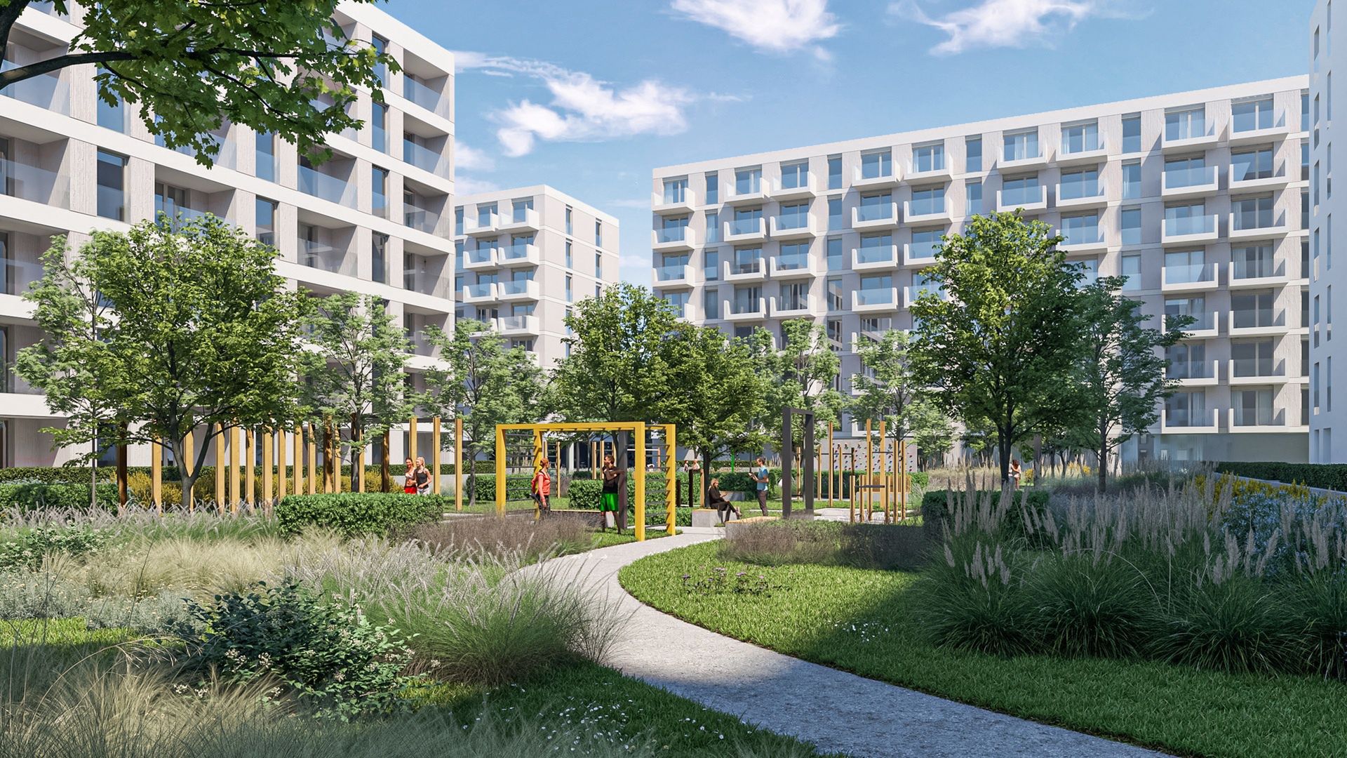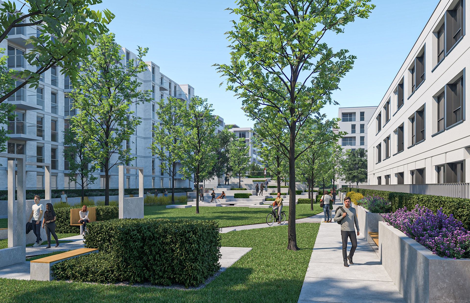 Nowy Ursus będzie nowoczesnym, zrównoważonym centrum życia społecznego. Stworzymy Plac Miejski – przestrzeń spotkań z fontanną i kawiarniami, Park z alejkami i strefami rekreacji, a także Plac Sztuki, współtworzony z mieszkańcami i przeznaczony na wydarzenia kulturalne. Ogromny nacisk kładziemy na naturę – blisko 31% powierzchni to tereny biologicznie czynne, zaplanowaliśmy też setki nowych drzew, łąki kwietne, ogrody deszczowe oraz rozwiązania retencyjne.