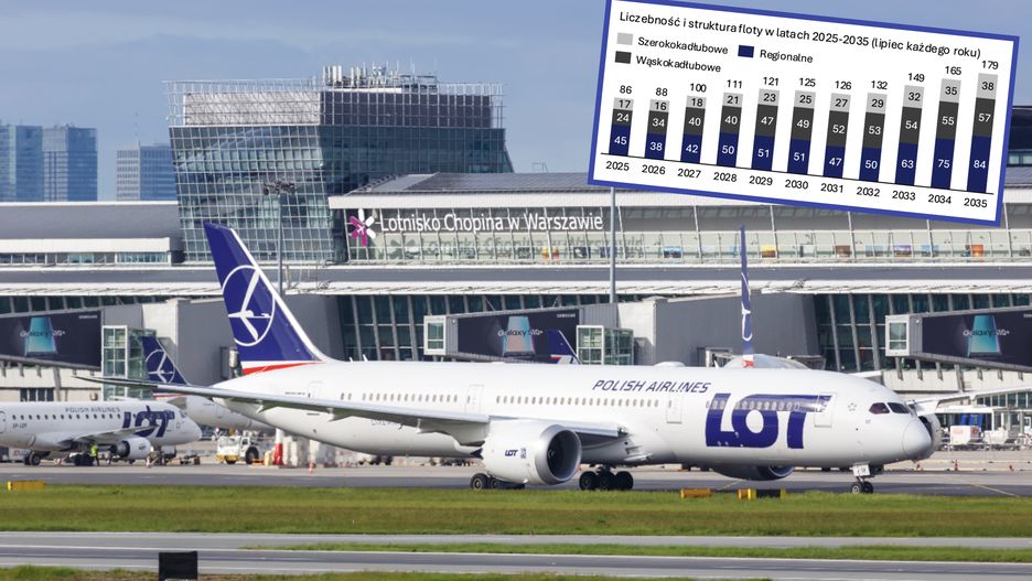 W 2032 r., czyli planowanym roku otwarcia Centralnego Portu Komunikacyjnego, LOT ma dysponować 132 samolotami. Według planów przewoźnika będzie to 29 samolotów szerokokadłubowych, 53 samoloty wąskokadłubowe i 50 samolotów regionalnych. Widać zatem, że największe wzrosty LOT planuje w segmencie samolotów dalekiego i średniego zasięgu. W 2035 r. podwojeniu - w stosunku do 2025 r. - ma ulec liczba samolotów w każdym z trzech segmentów.