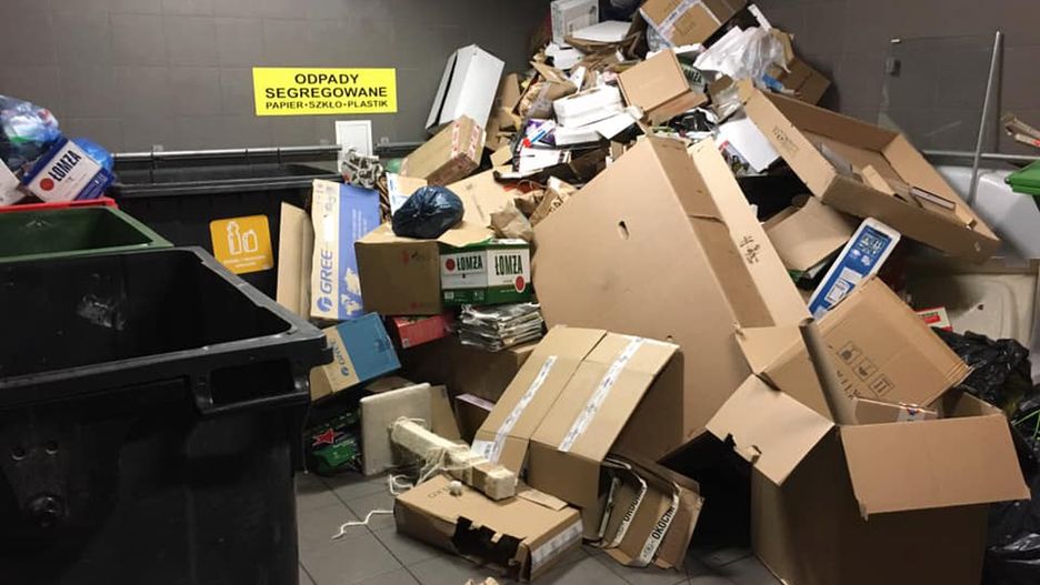 Efekty takiego podejścia widać na powyższym obrazku. Mieszkańcy narzekają, że przy wyrzucaniu śmieci muszą podziwiać stertę kartonów, przez które niedługo nie będzie się można przedostać do innych pojemników.