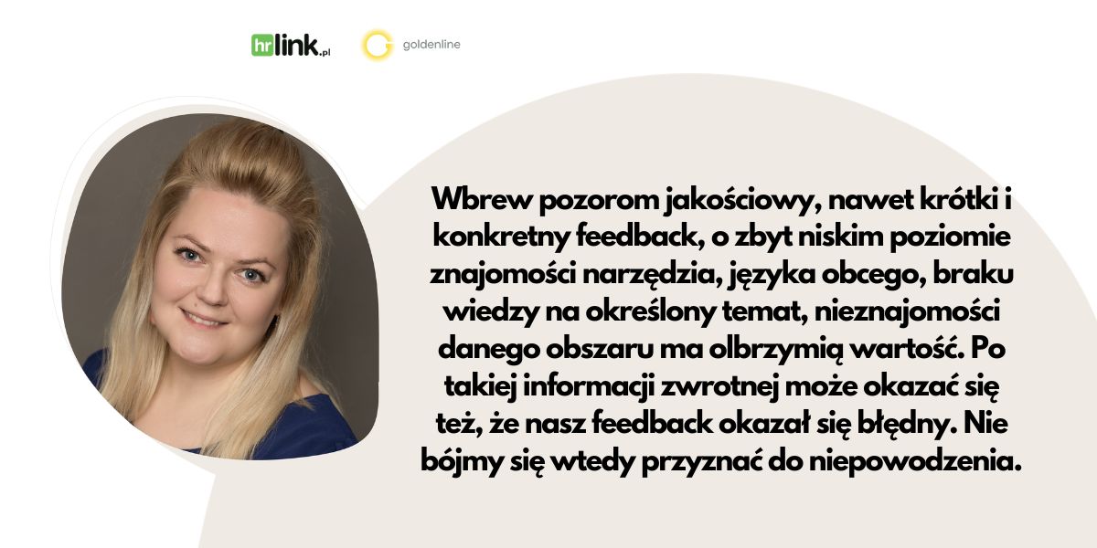 - W rekrutacji informacja zwrotna ma znaczenie fundamentalne. Nie tylko dla kandydatów, którzy przeszli do finałowego etapu. Wbrew pozorom jakościowy, nawet krótki i konkretny feedback, o zbyt niskim poziomie znajomości narzędzia, języka obcego, braku wiedzy na określony temat, nieznajomości danego obszaru ma olbrzymią wartość. Po takiej informacji zwrotnej może okazać się też, że nasz feedback okazał się błędny. Nie bójmy się wtedy przyznać do niepowodzenia. Budowanie Candidate i Employee Experience wpływa na naszą markę, niezależnie od tego, czy funkcjonuje w segmencie B2B czy B2C – mówi Alina Michałek, ekspert HR w HRlink i Goldenline.