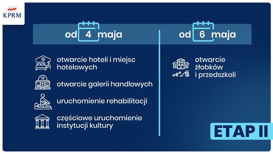Drugi zapowiadany etap znoszenia ograniczeń związanych z COVID-19 rozpocznie się od otwarcia centrów handlowych, sklepów budowlanych (do tej pory nieczynnych w weekendy). Swoją działalność wznowią również obiekty hotelowe.