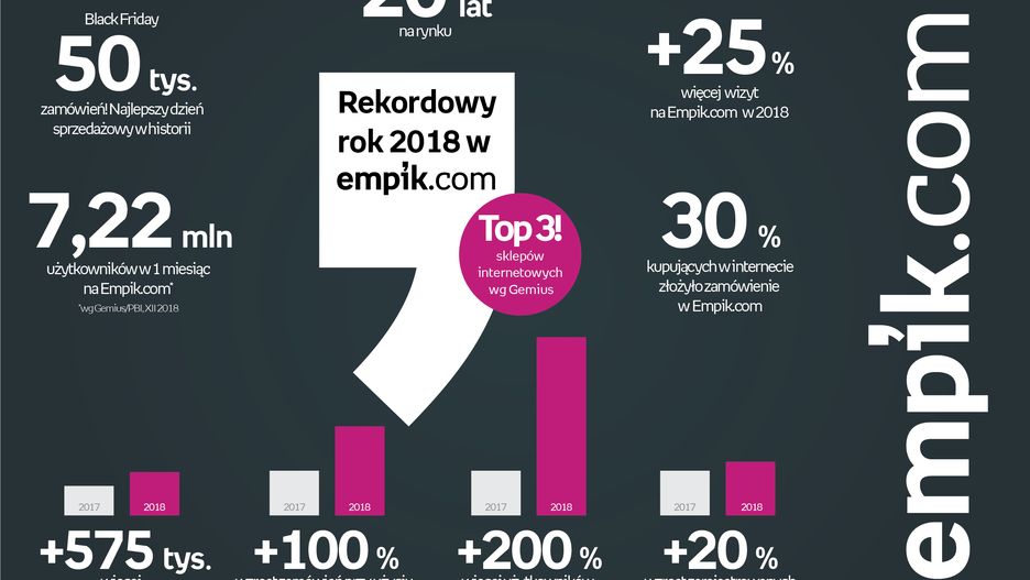W 2018 roku ruch na stronie Empik.com wzrósł o 25% w stosunku do 2017 roku, a klienci złożyli o 575 tysięcy więcej zamówień. To oznacza, że aż 30% Polaków korzystających z zakupów online, złożyło zamówienie właśnie w sklepie internetowym Empiku! Również ubiegłoroczny Black Friday można zaliczyć do rekordowych – Empik.com odnotował w tym dniu ponad 50 tys. zamówień, co stanowiło najlepszy sprzedażowo dzień w historii sklepu. Tym samym platforma Empiku ugruntowała swoją pozycję w pierwszej trójce najpopularniejszych sklepów internetowych w Polsce wg badań Gemiusa.