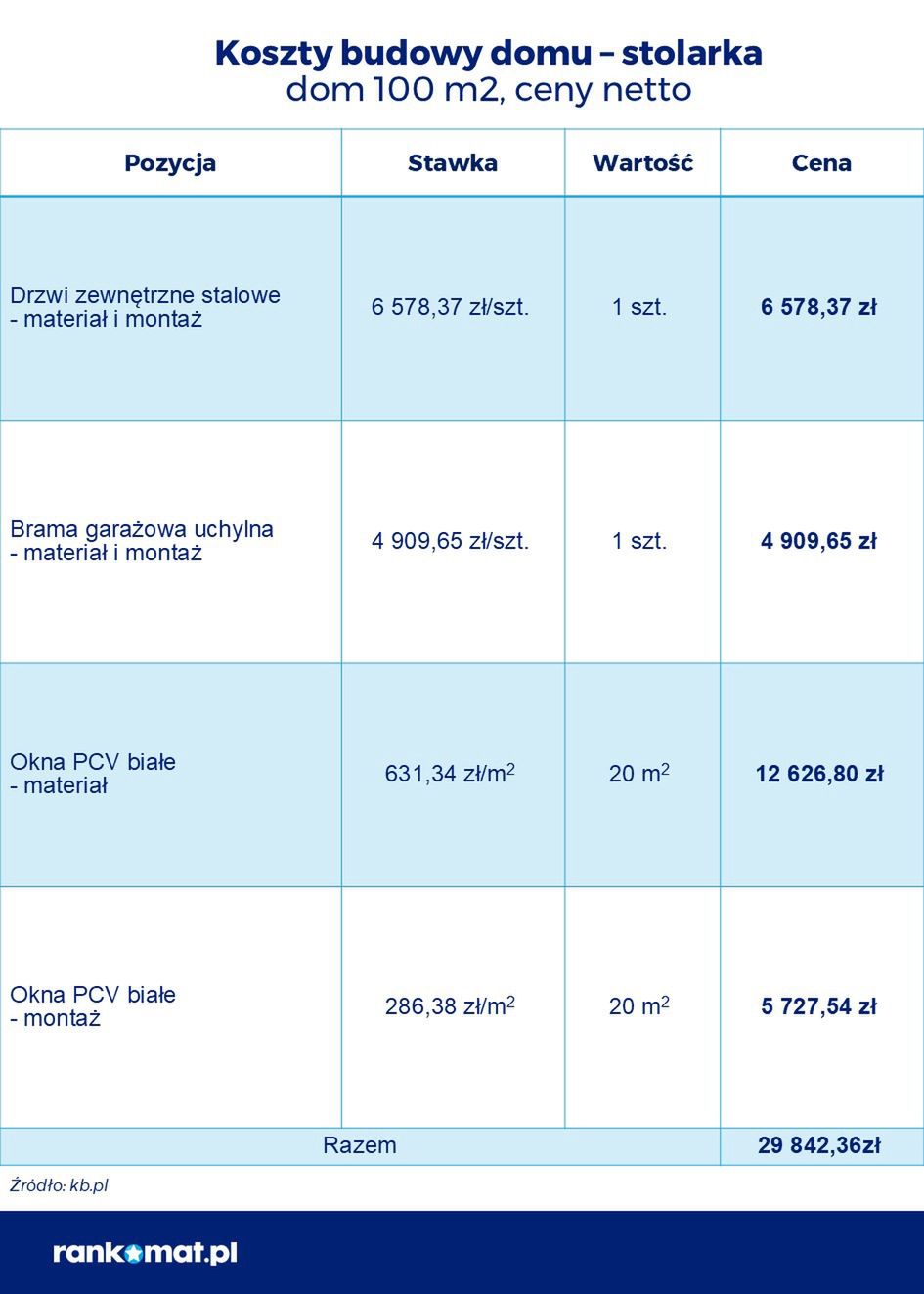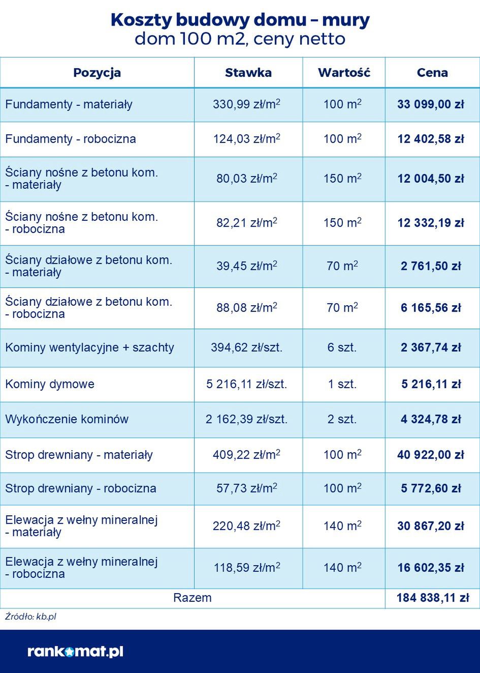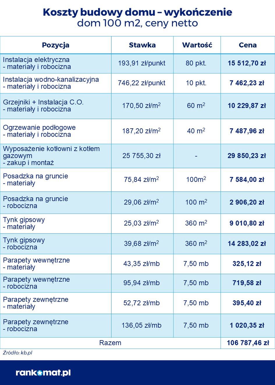 Serwis rankomat.pl przeanalizował, ile obecnie kosztuje postawienie 100-metrowego parterowego domu w stanie deweloperskim, opierając się na kosztorysie wyliczonym przez portal kb.pl. Jak czytamy w informacji prasowej, na taką inwestycję potrzeba dziś około 430 tys. zł. Wycena obejmuje koszty samej budowy, bez zakupu działki pod budowę domu ani prac wykończeniowych po uzyskaniu pozwolenia na użytkowanie nieruchomości zgodnie z przepisami prawa budowlanego. Na infografikach w dalszej części tekstu przedstawione zostały szacunkowe koszty dla poszczególnych rodzajów prac: związanych z budową murów, dachu, wstawieniem stolarki okiennej i wykończeniem.