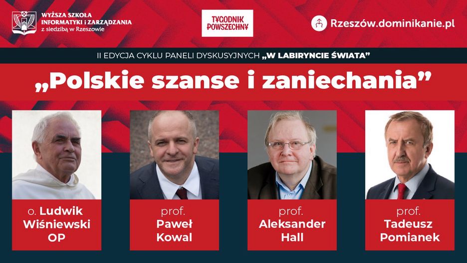 Jakie są zatem rozwoju gospodarczego w Polsce? Czy wolność jest dana raz na zawsze? Jakie są pozytywne skutki okresu transformacji, a jakie zjawiska uczyniły koszty transformacji nadmiernie wysokimi? I w końcu co zrobić, aby wzajemna nieufność i niechęć była źródłem refleksji, która zrodzi koncept na odnowienie państwa – państwa, które potrafi wykorzystać potencjał i społeczną energię na rzecz wspólnego dobra? Na te i wiele innych pytań odpowiedzą w czasie panelu dyskusyjnego inaugurującego cykl „W labiryncie świata” wybitni eksperci: o. Ludwik Wiśniewski OP, prof. Aleksander Hall, prof. Paweł Kowal oraz prof. Tadeusz Pomianek. Spotkanie odbędzie się 18 grudnia br., o godz. 17:00, w Filharmonii Podkarpackiej im. Artura Malawskiego.