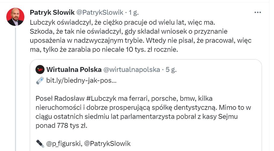 - Staram się nie używać mocnych słów wobec innych parlamentarzystów, ale jakie słowa mogą cisnąć się na język na myśl o parlamentarzyście, który jeździ luksusowym Ferrari i Porsche, a mimo to wyciąga rękę po prawie 800 tysięcy złotych od Sejmu - ze względu na "trudną sytuację finansową". Odpowiedź na to pytanie pozostawię Państwa czytelnikom. Wstyd Panie Pośle Lubczyk, wstyd - komentuje dla money.pl poseł Przemysław Czarnecki.