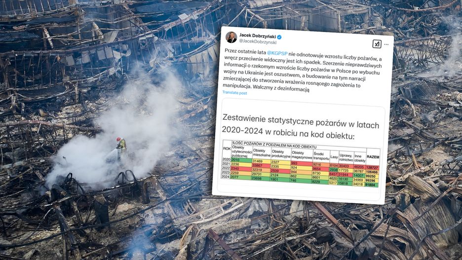 "Szerzenie nieprawdziwych informacji o rzekomym wzroście liczby pożarów w Polsce po wybuchu wojny na Ukrainie jest oszustwem, a budowanie na tym narracji zmierzającej do stworzenia wrażenia rosnącego zagrożenia, to manipulacja. Walczmy z dezinformacją" - dodał. Do wpisu załączył tabelę z liczbą pożarów w latach 2020-2024.