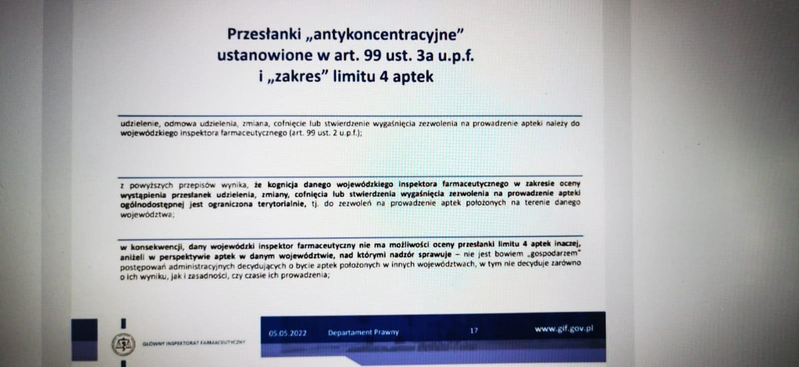 Prosi też, "byśmy wyraźnie rozdzielili obowiązującą interpretację przepisów prawa w zakresie stosowania przepisów antykoncentracyjnych w odniesieniu do aptek od debaty akademickiej, która – tak jak w przypadku wielu innych koncepcji – ma miejsce wewnątrz Inspekcji Farmaceutycznej".