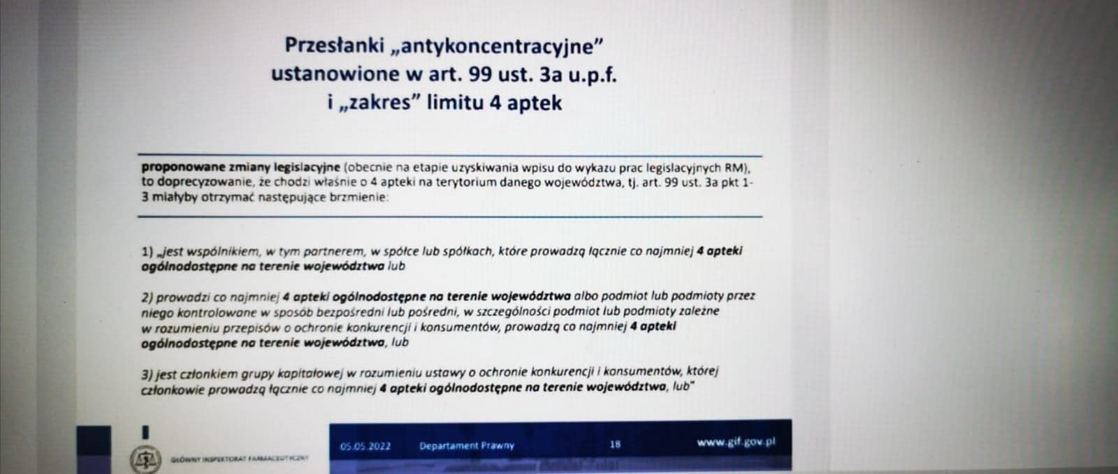 3) Czy Główna Inspektor Farmaceutyczna podtrzymuje, że "koncepcja zawierająca przepis mówiący o czterech aptekach w województwie jest jej zdecydowanie obca" oraz "nie jest jej zwolenniczką"? Jeżeli tak - dlaczego taką interpretację GIF przedstawił wojewódzkim inspektorom farmaceutycznym raptem kilka tygodni temu?