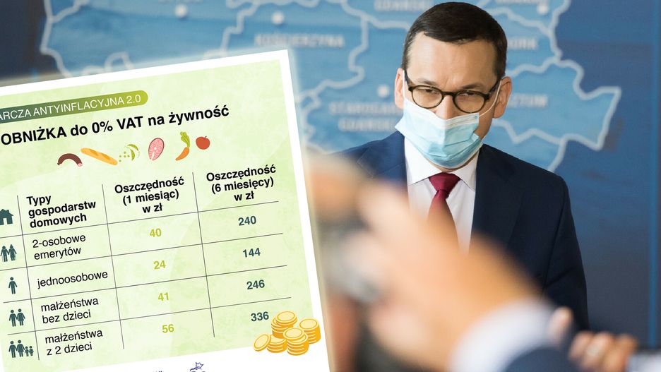Premier opublikował na Facebooku grafikę, która ma pokazywać, ile zaoszczędzą różne grupy po obniżeniu VAT-u do 0 proc. na żywność. Zgodnie z przedstawionymi przez niego wyliczeniami, dwójka emerytów miesięcznie zyska 40 zł, a małżeństwo z dwójką dzieci w pół roku zaoszczędzi 336 zł. Tarcza antyinflacyjna 2.0 zakłada m.in. obniżkę VAT-u na żywność, nawozy i gaz na pół roku.