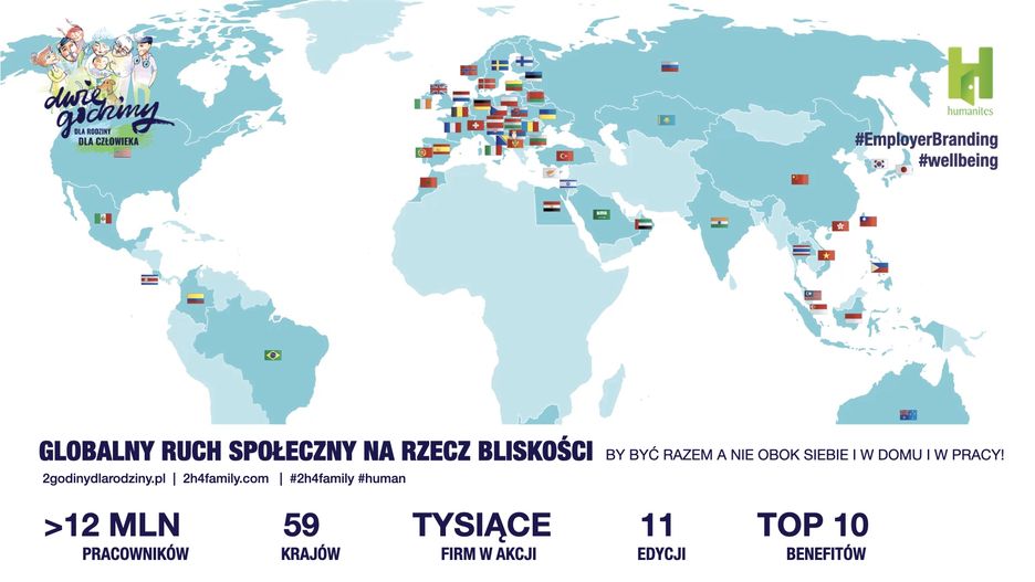 Kampania zainicjowana 11 lat temu przez Instytut Humanites cieszy się coraz większym uznaniem na świecie, angażując firmy z aż 59 państw! Dwie Godziny dla Rodziny/dla Człowieka to doskonałe rozwiązanie dla pracodawców, którzy myślą na serio o systemowych zmianach społecznych i właśnie teraz planują swoje strategie HR, CSR i ESG na rok