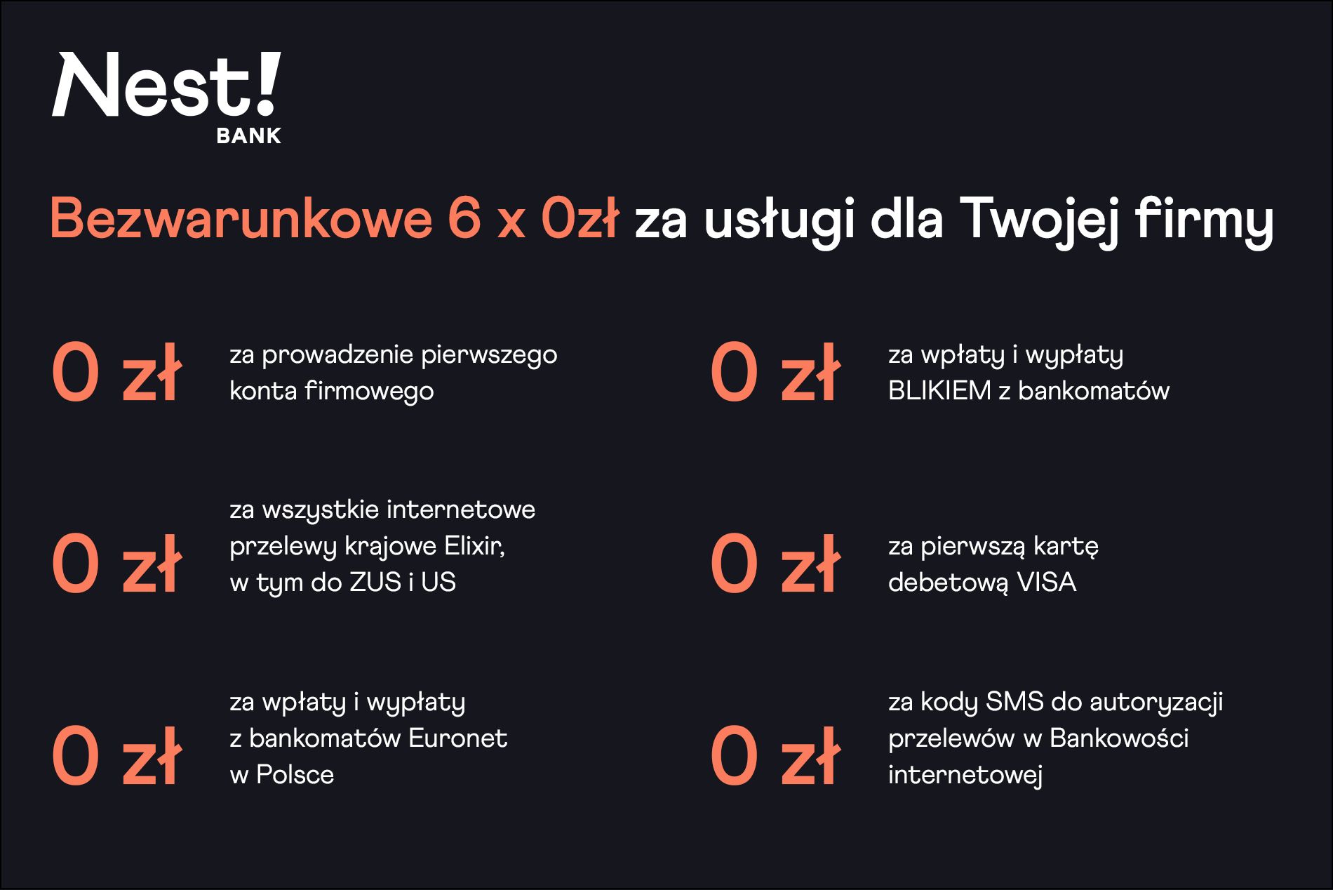 Założenie rachunku firmowego to jedna z najważniejszych czynności, która czeka nas na początku. Dlatego wybór banku, który będzie obsługiwał nasze finanse warto odpowiednio wcześniej przemyśleć. Bo choć zdecydowana większość instytucji posiada w swym portfolio konta dla przedsiębiorców, to oferta ofercie nie jest równa. Otwierając firmowy rachunek, warto wybrać bank, który nie będzie od nas żądał comiesięcznych opłat czy naliczał prowizji za wykonane przelewy oraz wpłaty i wypłaty z bankomatów. Takie warunki przygotował dla firm m.in. Nest Bank.
