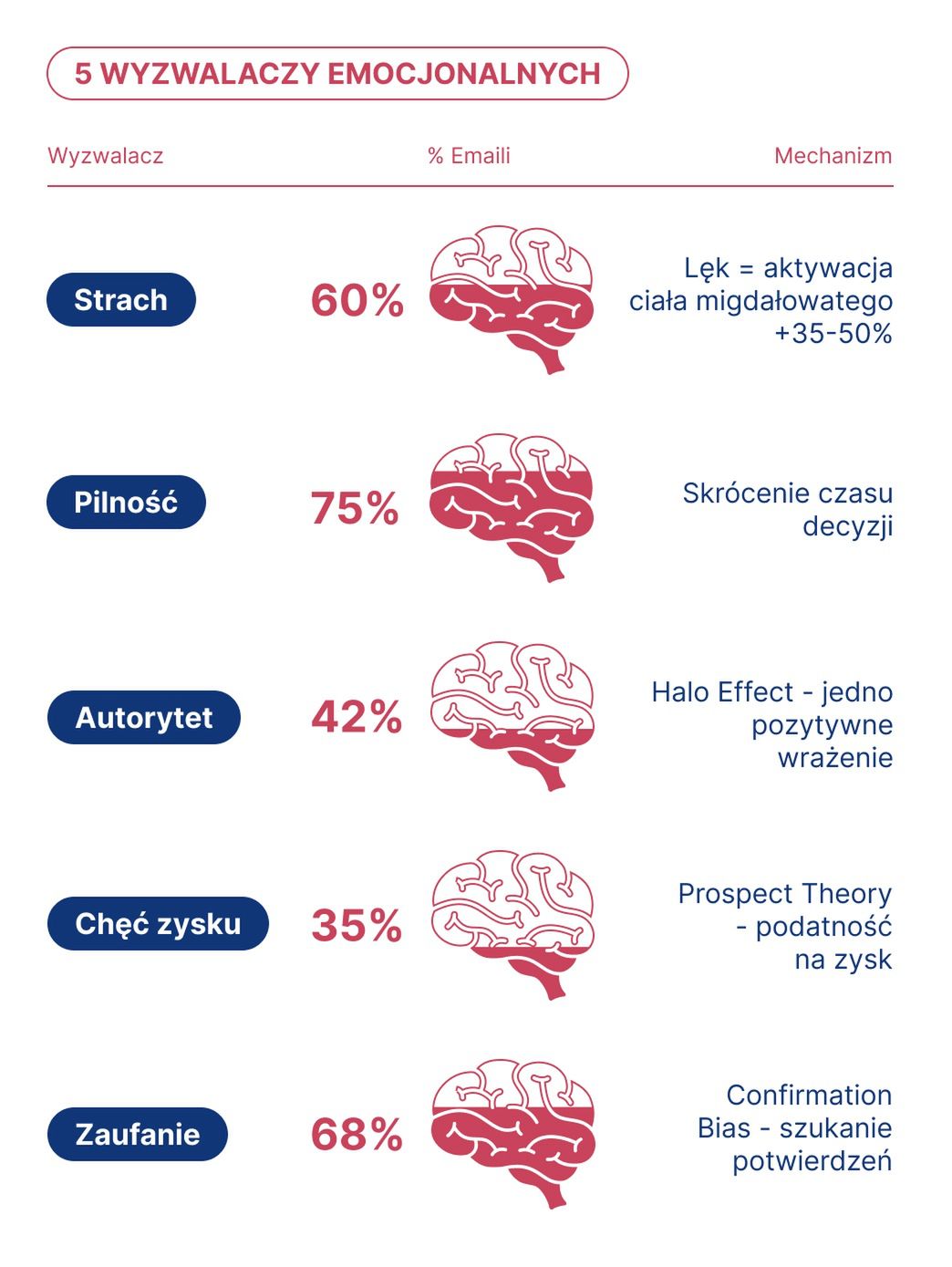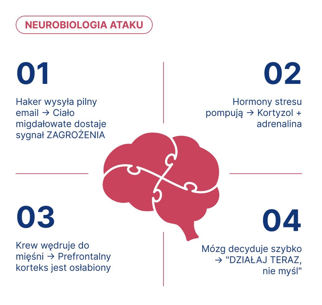 Kluczową rolę odgrywa tu ciało migdałowate (amygdala) – struktura odpowiedzialna za wykrywanie zagrożeń. Komunikat typu "Twoje konto zostało zablokowane" lub "Wykryto nieautoryzowany dostęp" działa jak syrena alarmowa. Dochodzi do zjawiska zwanego "amygdala hijack" (porwanie emocjonalne). Informacja o zagrożeniu bardzo szybko aktywuje ciało migdałowate, a dopiero później – wolniejszy, analityczny układ w korze przedczołowej [9][10].