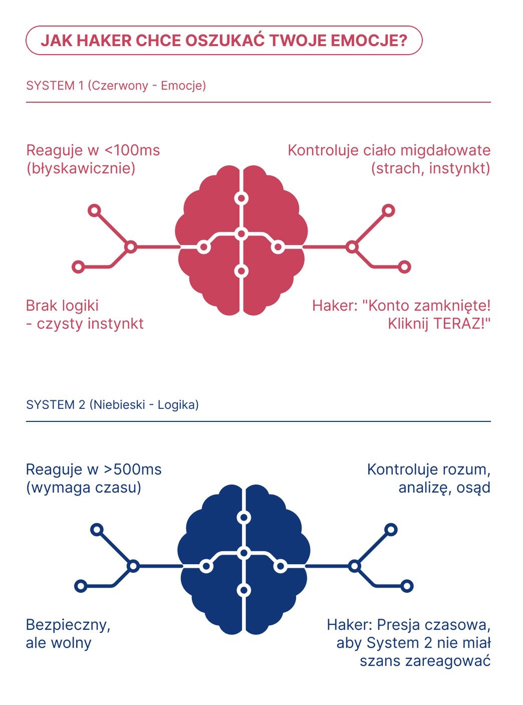Aby zrozumieć, dlaczego nawet ostrożne osoby podejmują ryzykowne decyzje w sieci, musimy zajrzeć do wnętrza czaszki. W momencie ataku phishingowego dochodzi do starcia dwóch systemów myślenia opisanych przez noblistę Daniela Kahnemana: Systemu 1 (szybkiego, emocjonalnego) i Systemu 2 (wolnego, logicznego). Celem oszusta jest przeciążenie lub zdominowanie Systemu 2, tak aby decyzje podejmował wyłącznie emocjonalny System 1.