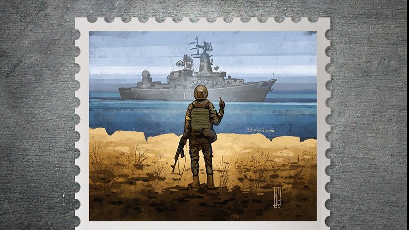 Ukroposzt (ukraiński operator pocztowy) zaprezentował zwycięski projekt znaczka pocztowego, który ma uhonorować bohaterskich obrońców Wyspy Węży, którzy wypowiedzieli jedno z najbardziej ikonicznych zdań, które padły dotąd w trakcie agresji Rosji na Ukrainę - "Rosyjski okręcie wojenny, p****** się!". Słowa te obleciały cały świat i są symboliczną odezwą ukraińskiego uporu i bohaterstwa.