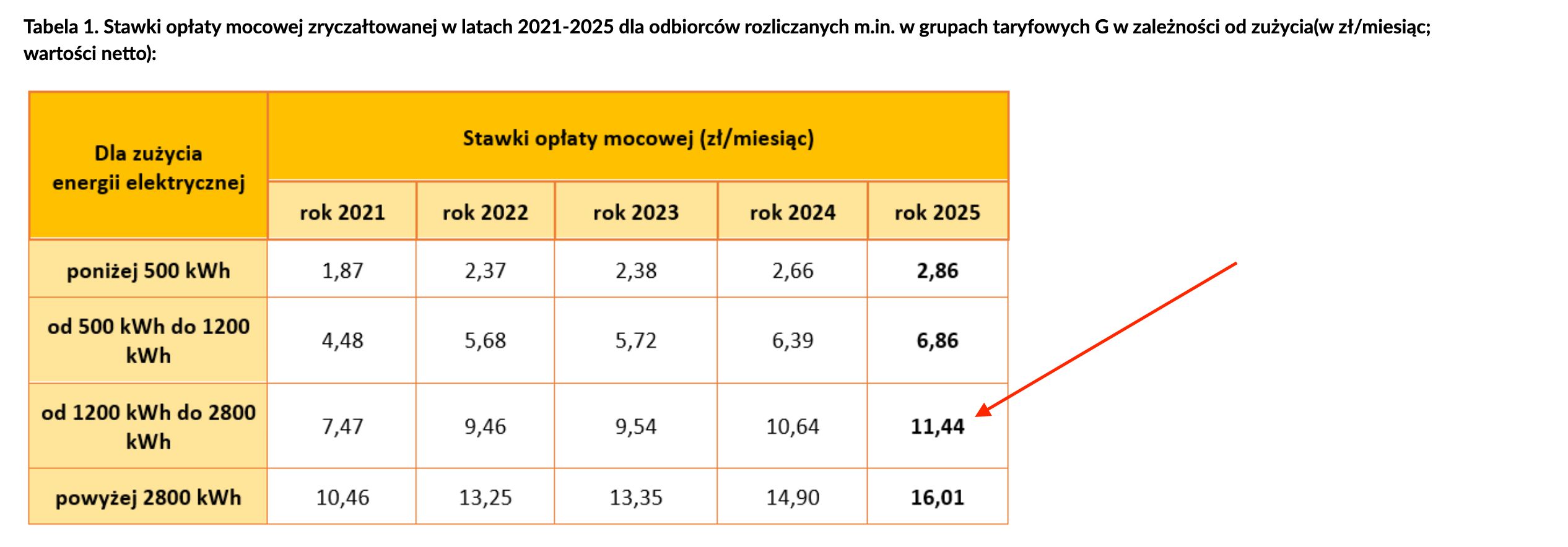 W pierwszej kolejności sprawdźmy, jak na rachunek wpłynie przywrócenie opłaty mocowej. Zgodnie ze stawkami w tabeli na stronie URE w przypadku rocznego zużycia na poziomie 2500 kWh klient indywidualny będzie płacił comiesięczną stawkę 11,44 zł netto, czyli 14,07 zł brutto.